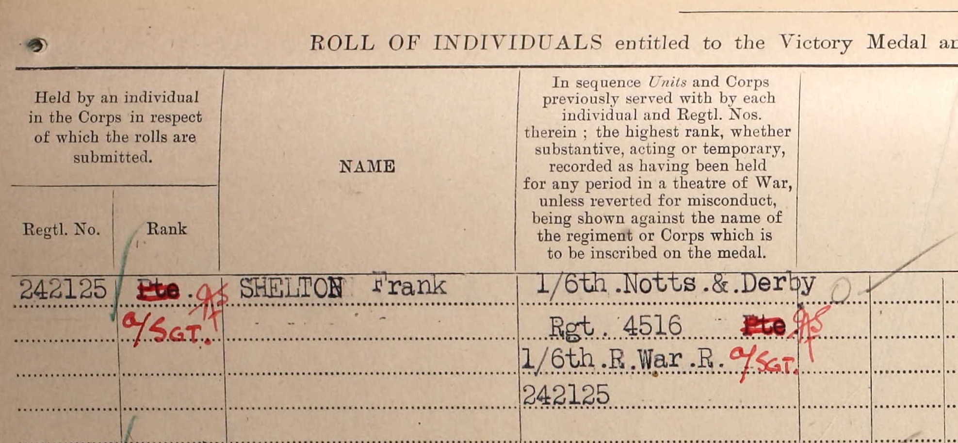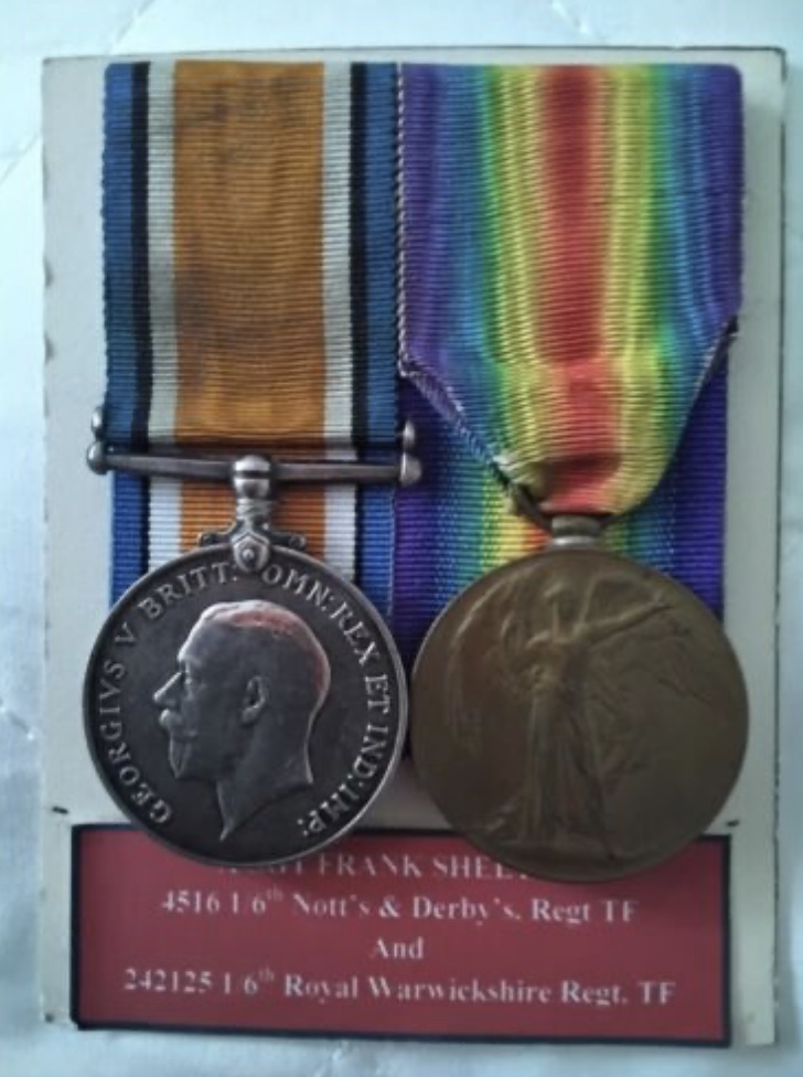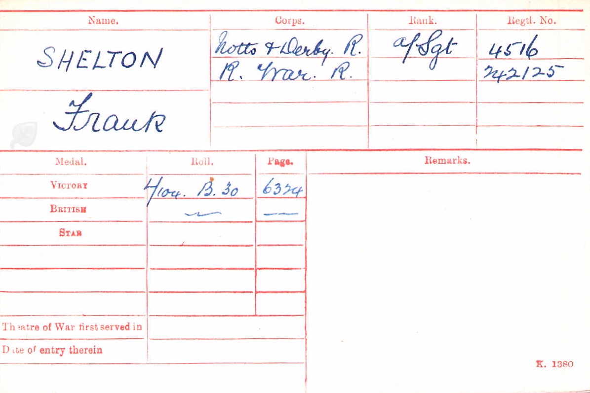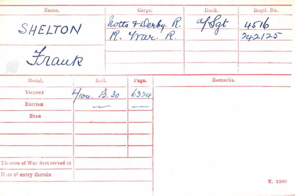 Frank enlisted into the 6th Battalion, The Sherwood Foresters in August 1915 and was issued the Regimental number 4516. His 4-digit number on the medal index card records his entitlement to the BWM and VM and suggests that he arrived in France in 1916.