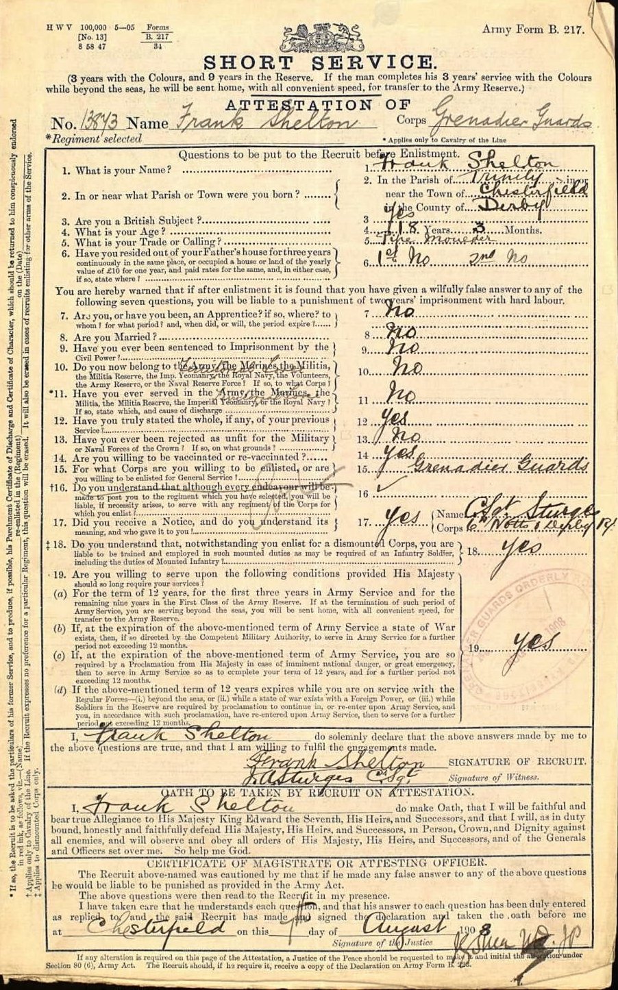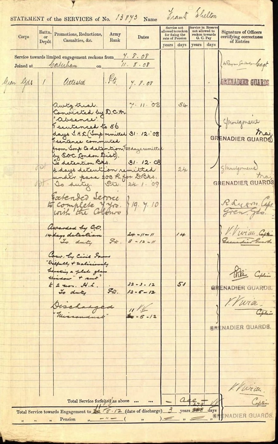 Frank enlisted into the Grenadier Guards in August 1908 and achieved a 3rd Class certificate of education in October 1909. However, it would appear that Frank suffered from a lack of military discipline and was eventually discharged due to ‘misconduct’ in May 1912.