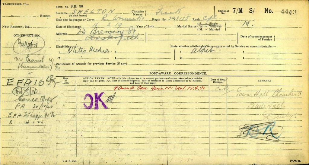 Frank was eventually discharged in March 1919 and received a pension.