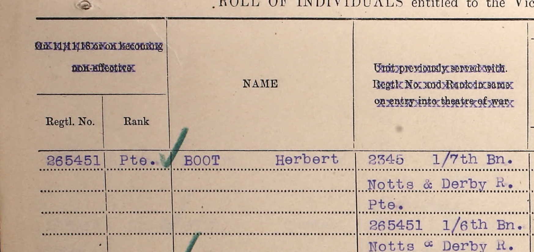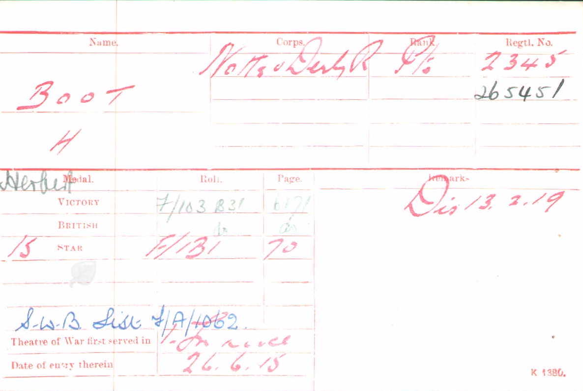 2345/26451 Pte Herbert Boot Leave a reply A brass moulder from Nottingham who enlisted in September 1914. Arrived in France in June 1915. Served with the 1/7th and 1/6th Battalions and suffered a GSW in the side – date unknown. Share this: Click to share on Facebook (Opens in new window) Facebook More Click to share on X (Opens in new window) X Like Loading... Related