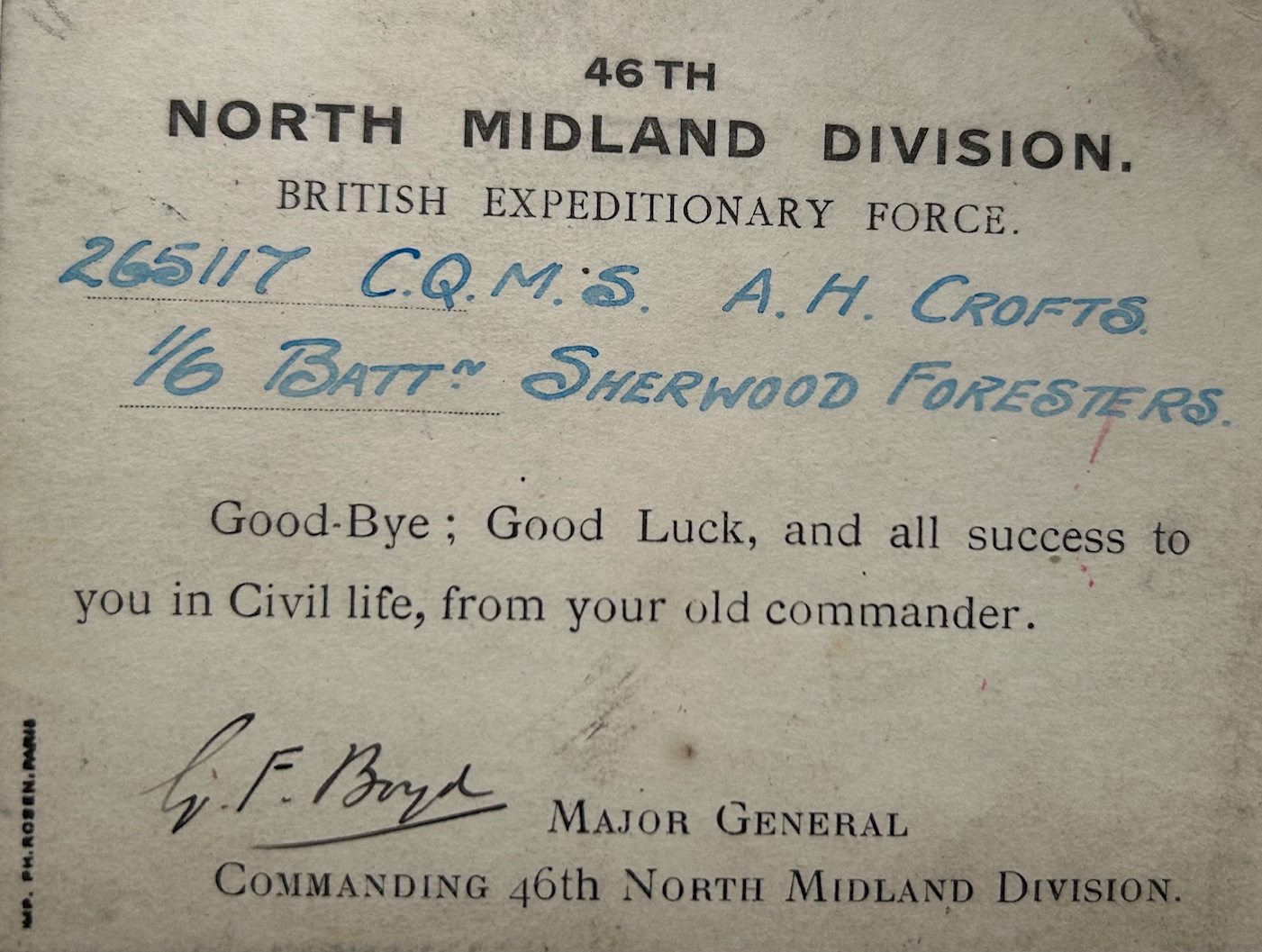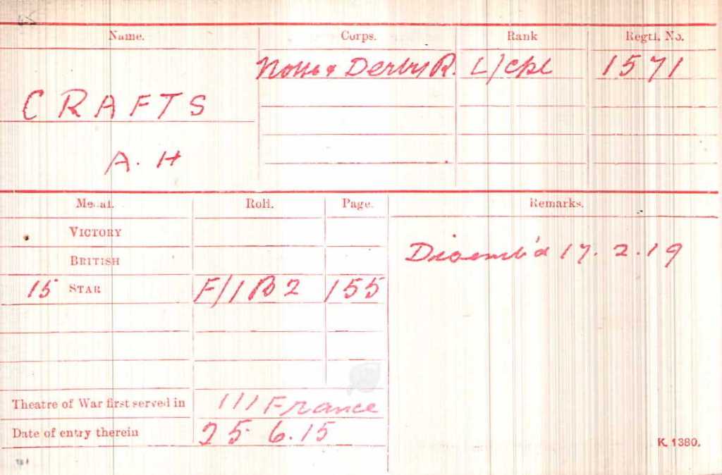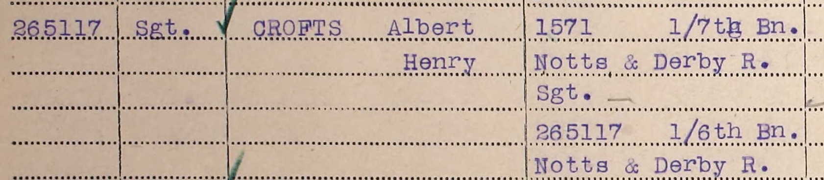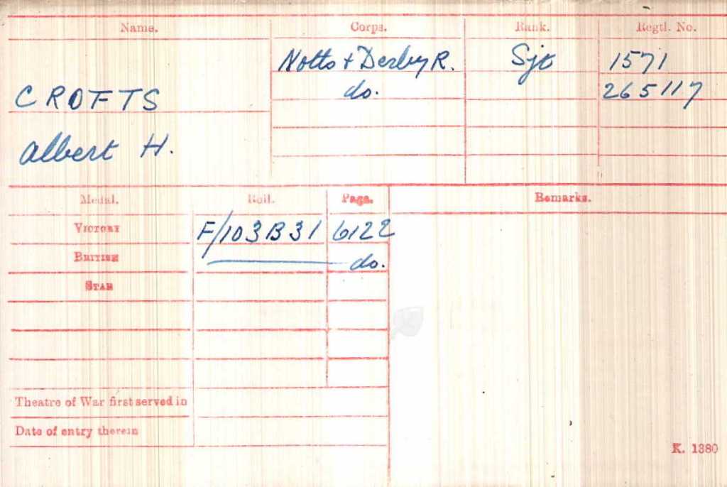 Albert Henry Crofts (Crafts) was born in 1881 and was a picture frame maker from Long Eaton. He enlisted into the 7th Battalion (Robin Hood Rifles) in February 1912 and arrived in France in June 1915 with the 1st reinforcement.
