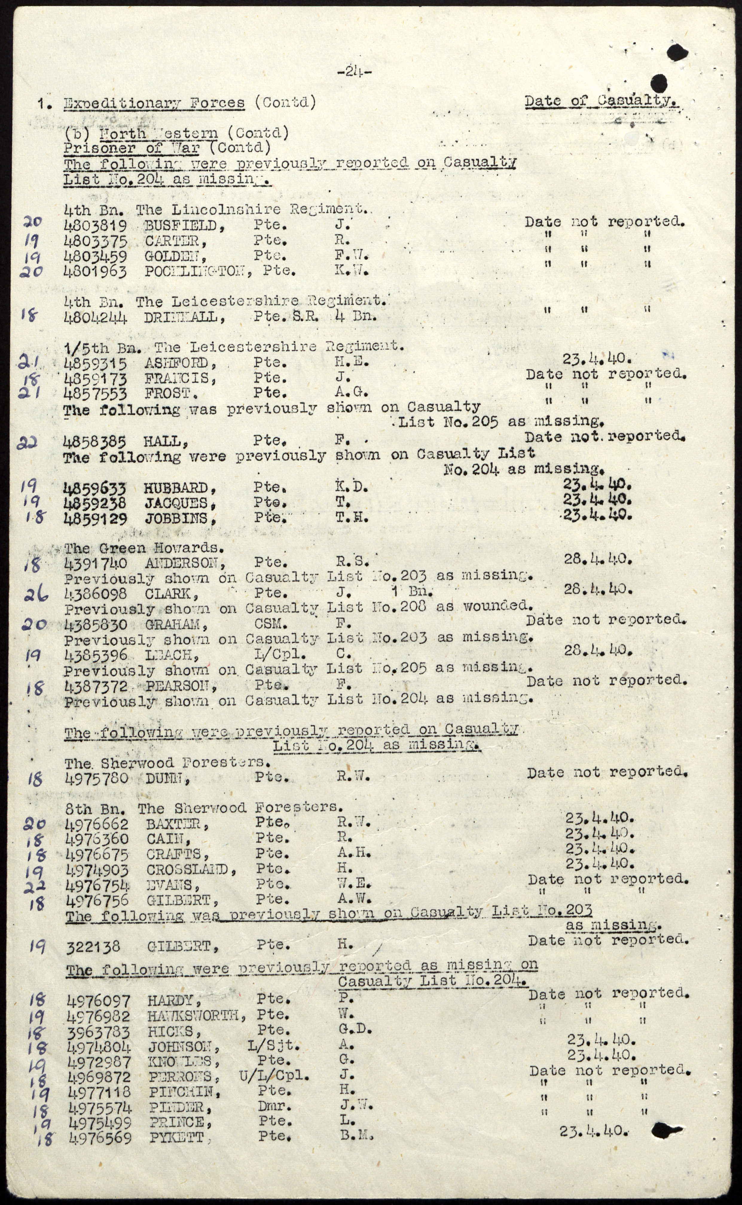 It would appear that Alfred was serving with the 8th Battalion, Sherwood Foresters at the outbreak of the Second World War and deployed with them to Norway where they suffered heavy casualties during the German invasion in April 1940.