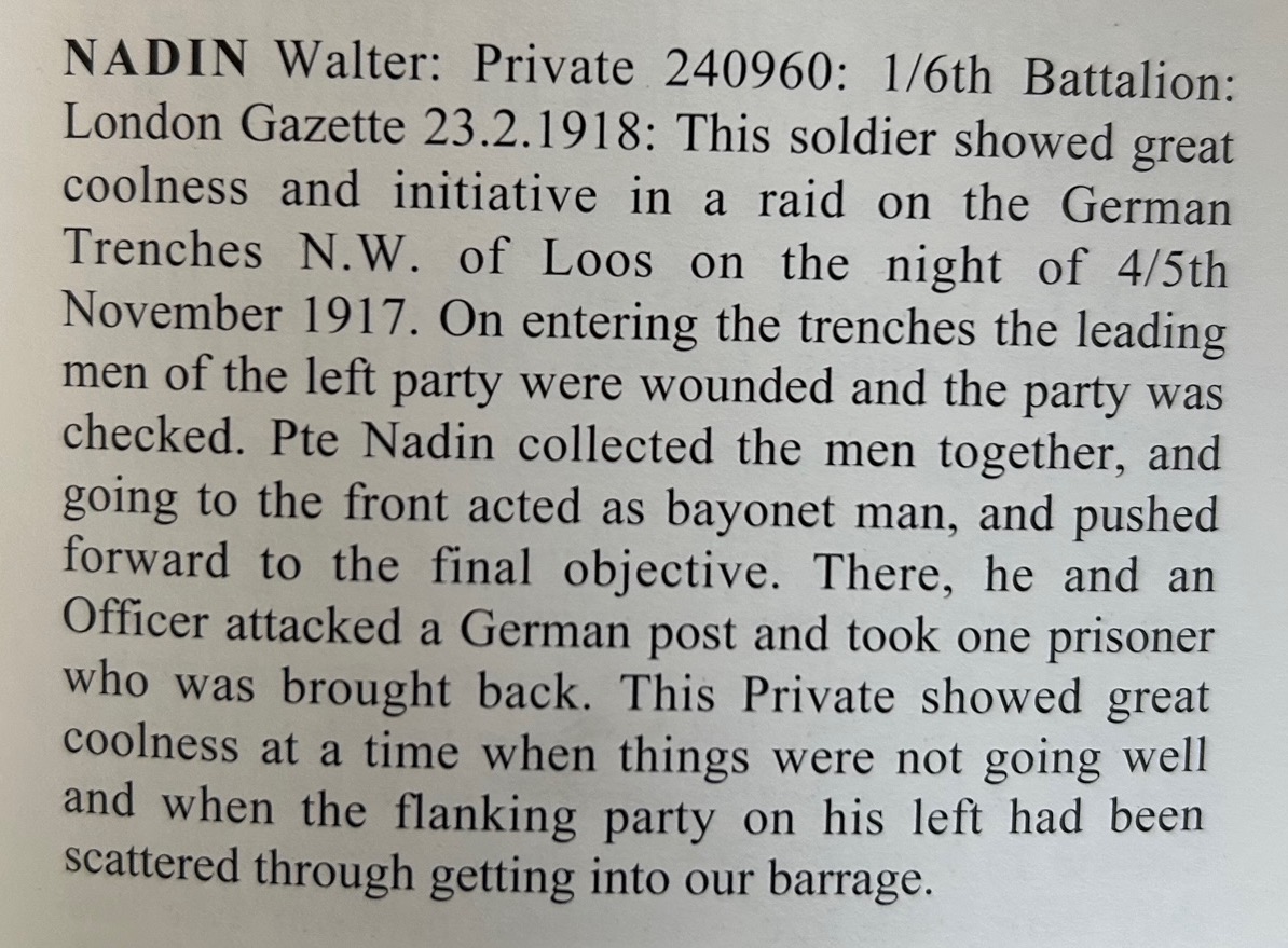 private Walter Nadin(naden) was my grandfather – He was from a quarrying family and he resided in chapel en Le Frith. He has a road named after him in the neighbouring village of Whaley Bridge. He married Gertrude Lomas of Whaley Bridge