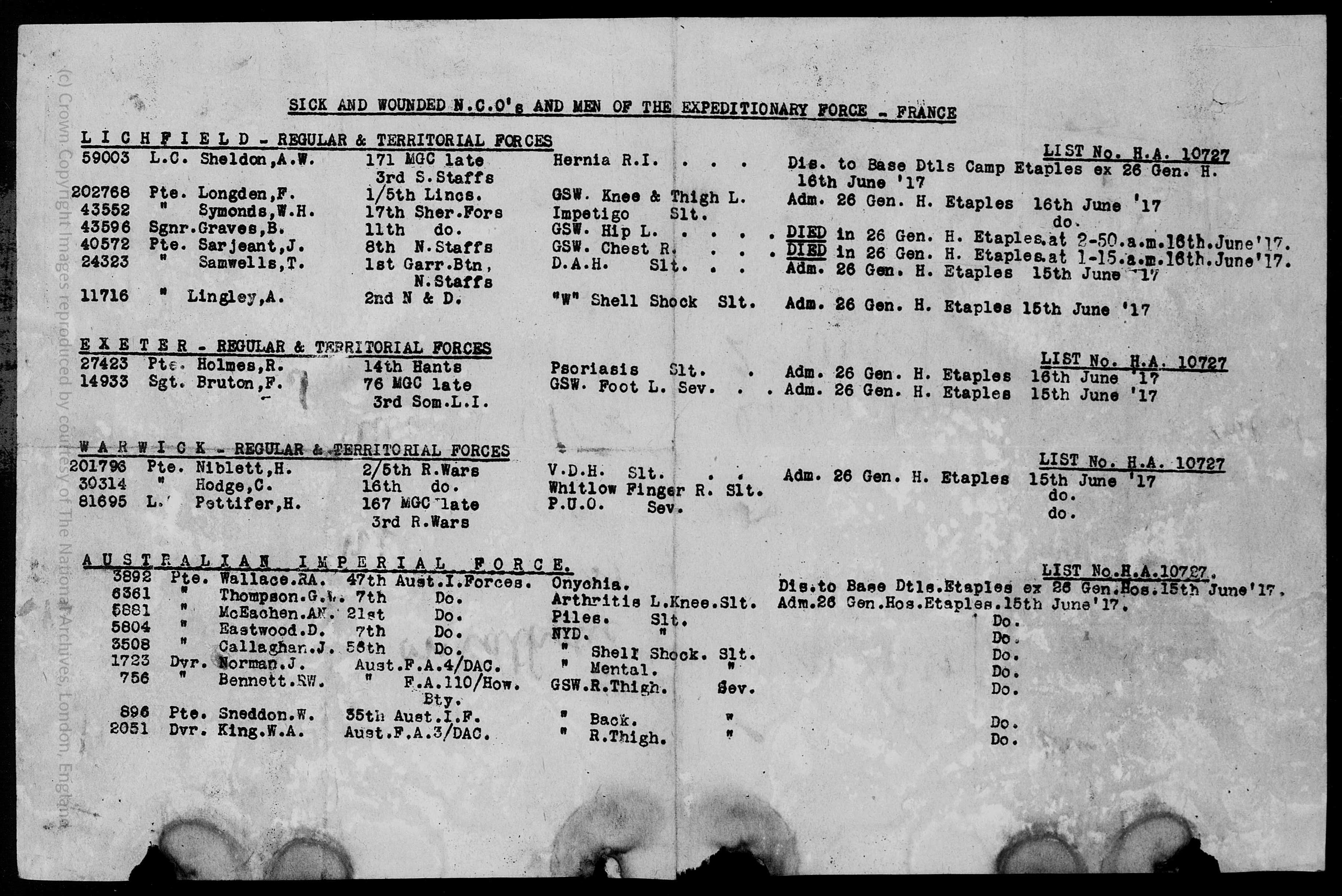 43552 Pte William Henry Symonds 17th Battalion; also served with 2/6th Battalion and 1st KLR. Admitted on 16th June with impetigo.