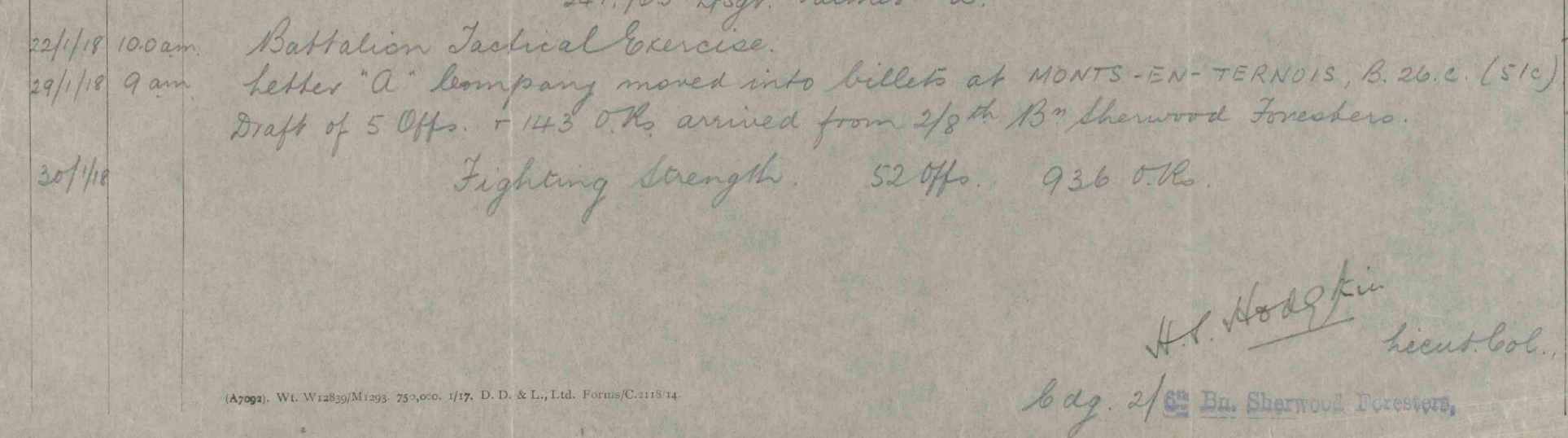 2/6th Battalion War Diary recording the arrival of 5 Officers and 143 Other Ranks from the 2/8th Battalion. Fighting strength was now at 52 Officers and 936 Other Ranks