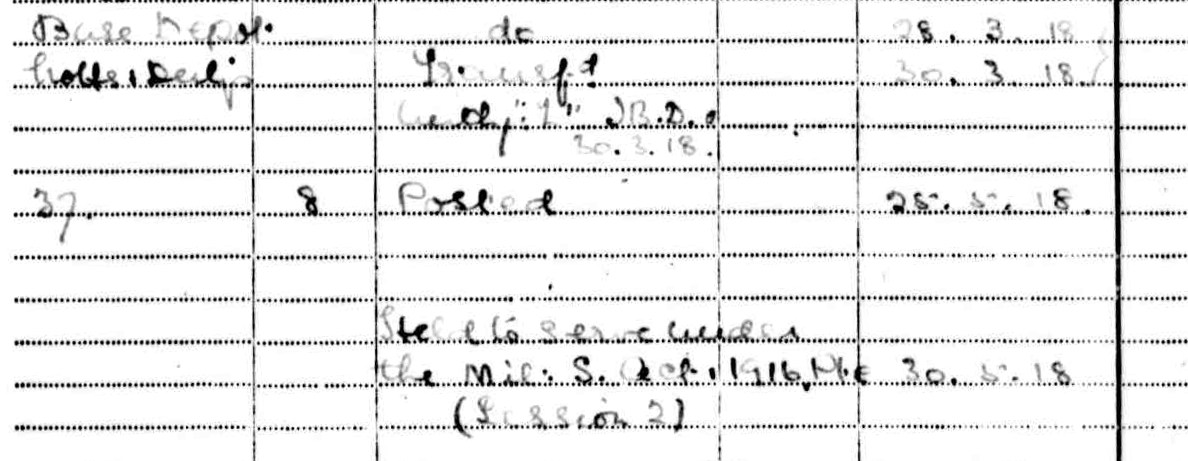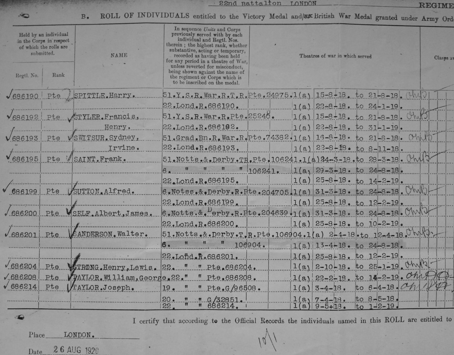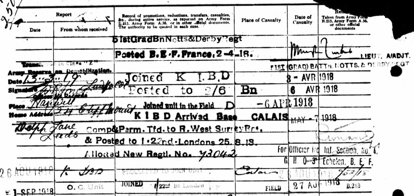 He was transferred to the 2/6th Battalion in March 1918 and then to the 22nd London Regiment on 24th August 1918