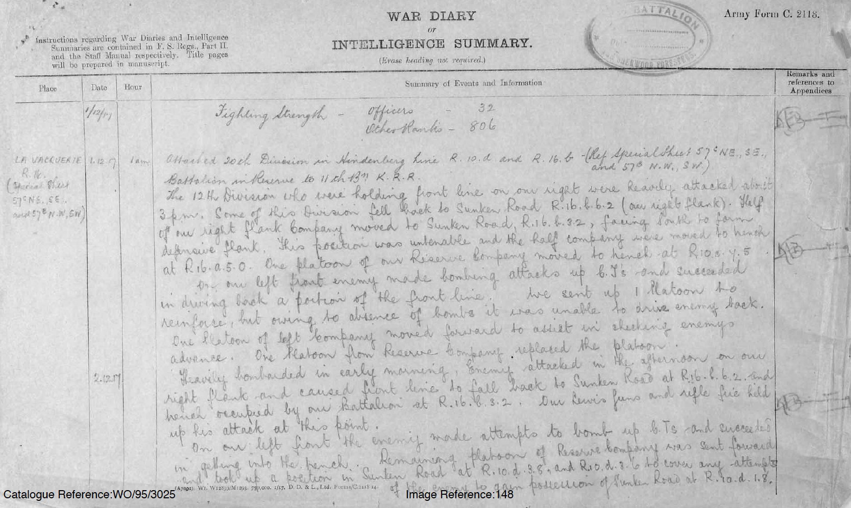 War Diary entry for the 1st and 2nd December 1917 describing the German attack on the British front line positions.