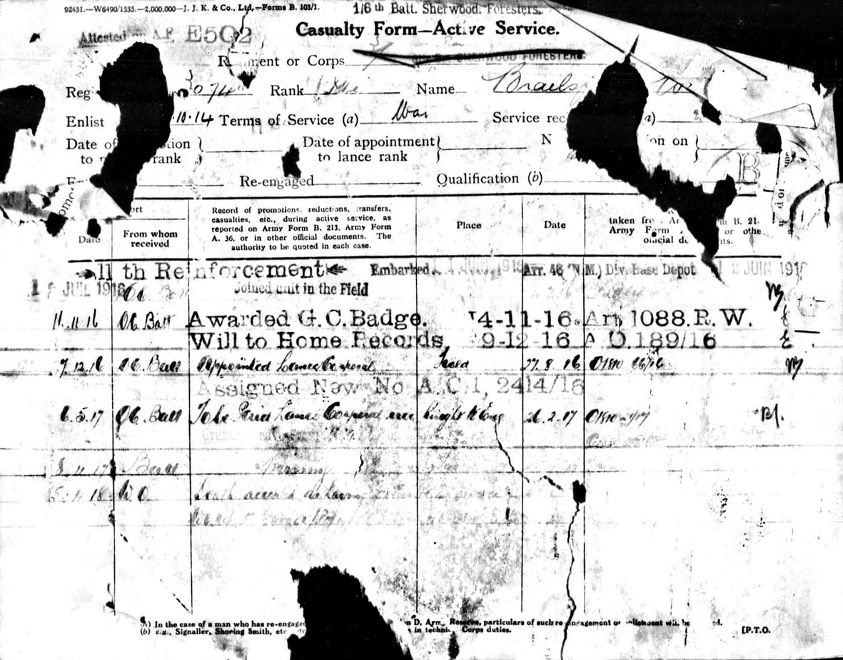 “Casualty Form – Active Service” stating that William Brailsford was recorded missing on the 8th November 1917, but it was not until the 5th April 1918 that it was accepted that death had occurred on or after the 5th November 1917.