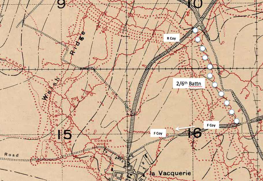 The 1/6th Battalion was instructed to carry out a raid on the German trenches known as New Trench, Hercules Trench and Hunt Trench. The raiding party consisted of four Officers and 124 other ranks. Following a successful raid in which 12 Germans were killed, the party returned with three prisoners. Casualties suffered by the raiding party included one Officer wounded (Lieutenant Cyril George Radford wounded in the abdomen), 2 men killed, 14 wounded and 5 missing.