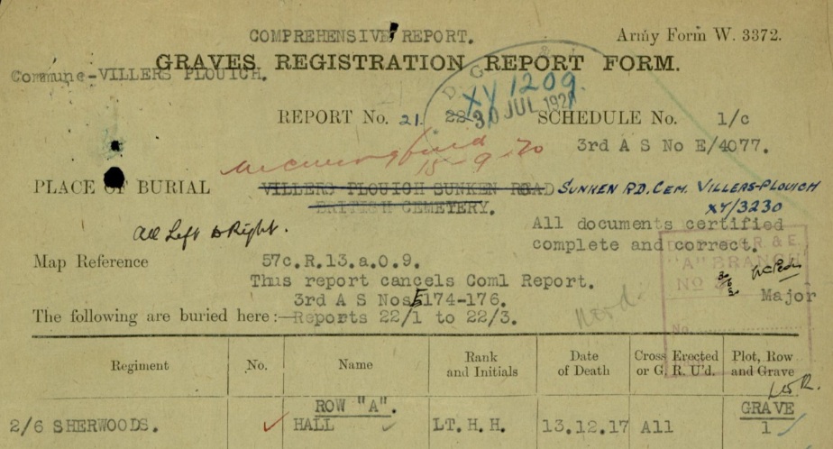 In total 2/Lt Harry Herbert Hall and 29 NCOs and men were killed during these two days of fighting. The body of Harry Hall was removed at the time and he is now buried in Sunken Road Cemetery in Villers-Plouich, whereas the bodies of his men were not and they are all Commemorated on the Cambrai Memorial at Louverval.