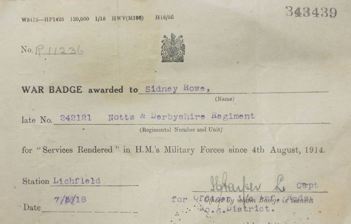 Silver War Badge Certificate issued to 242121 Pte Sidney Rowe who attested in December 1915 and was mobilised on the 6th September 1916. Later discharged in April 1918 due to wounds. Only served overseas with the 2/6th Battalion.