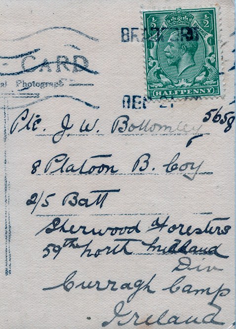 A post Card sent from 3151 Pte. Percy Feltham of “D” Company 2/6th Battalion from Curragh Camp to his mother at Shilton near Burford in Oxfordshire (Undated Celesque Series – No. 216)