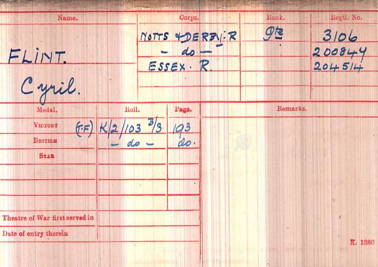 Cyril Flint enlisted into the 2/5th Battalion Sherwood Foresters in October 1914 and most likely served with the Battalion during the Easter Rising of 1916. He arrived in France in 1916 (because his 4-digit Regimental Number is recorded on the MIC) to serve with the 1/5th Battalion and was still serving with them in early 1917 during the Territorial Force renumbering.