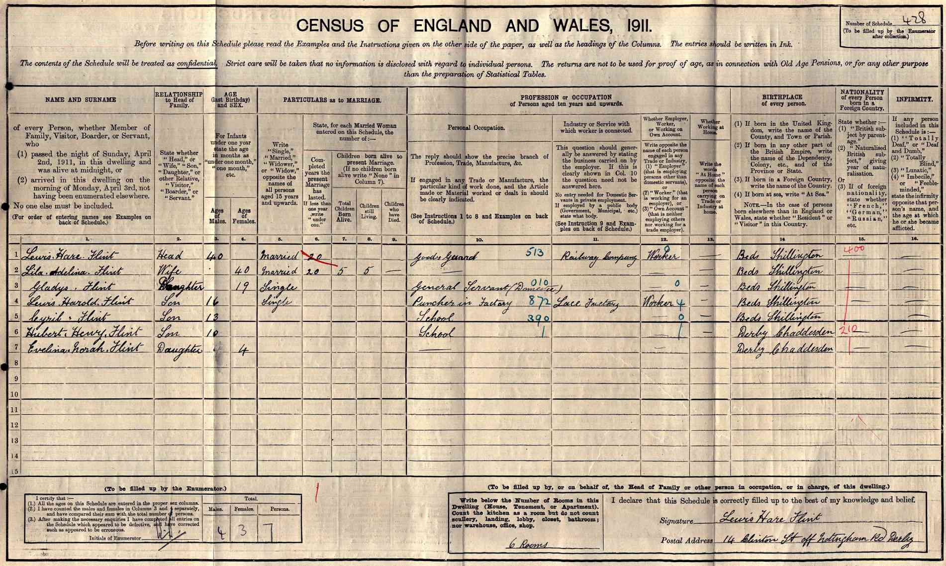 Cyril was born in 1898 and in the 1911 Census he lived with his family at 14 Clinton Street in Derby. Flint 1911 Census