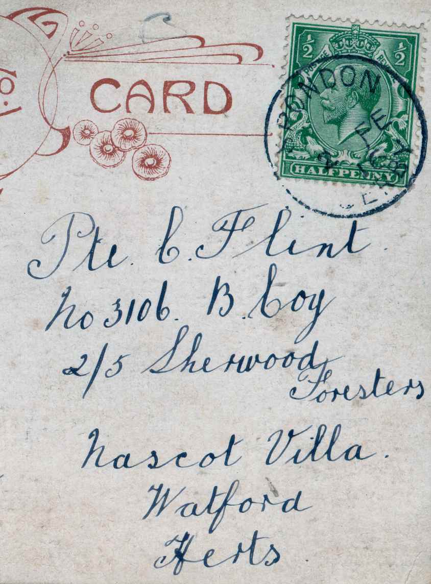 A sweetheart card sent to 3106 Pte. Cyril Flint of “B” Company the 2/5th Battalion Sherwood Foresters on 27th August 1915 from Miss Esther Mary Duroe.