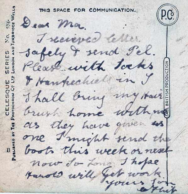 This card was sent by Dora to Cyril, who at this time was serving with “B” Company the 2/5th Battalion Sherwood Foresters in Ireland.