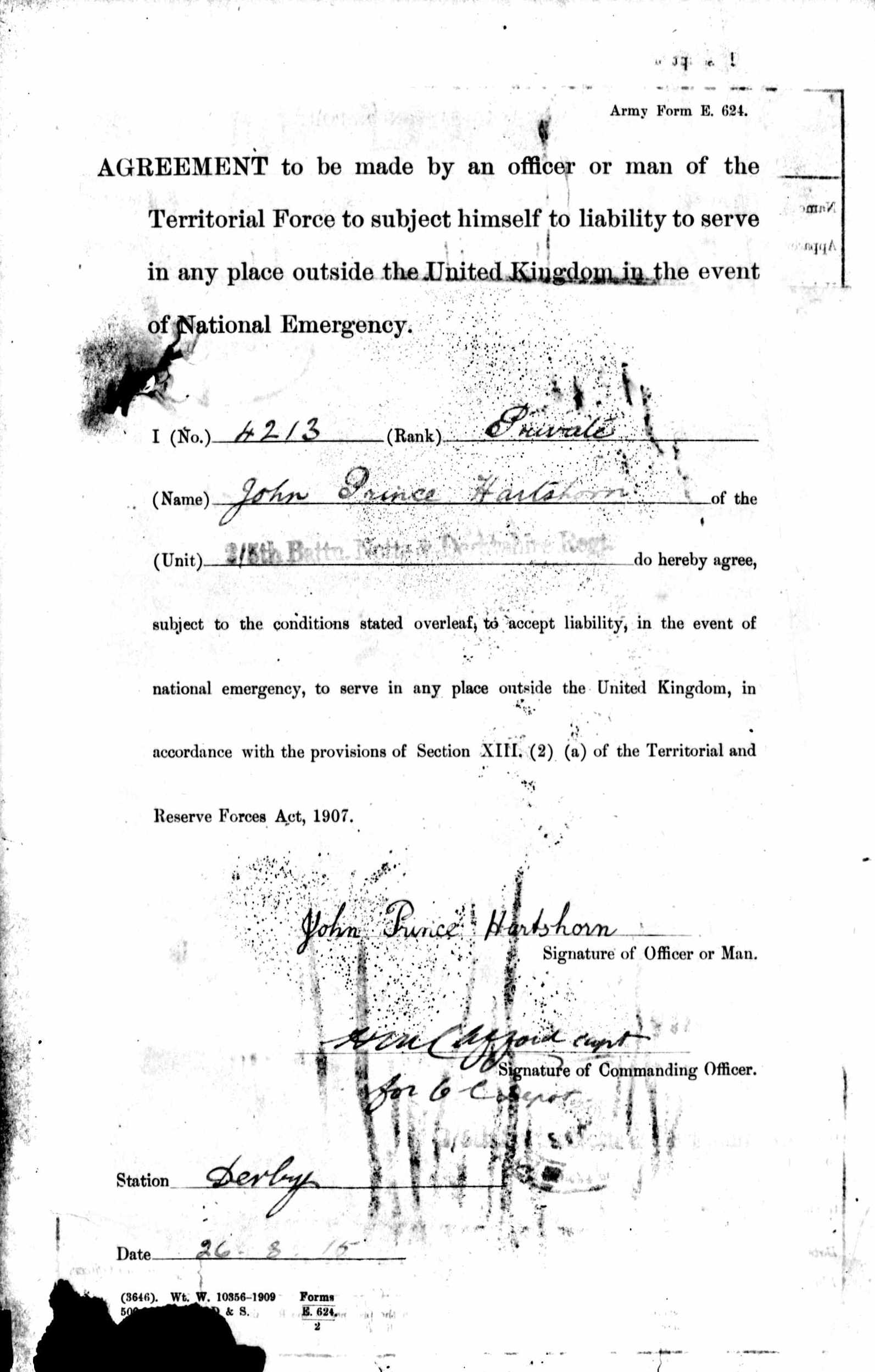 Posted to the Oxford and Buckinghamshire Light Infantry and served with the 1/5th Battalion in France from 28th July 1916 until he was wounded and returned to England on the 30th April 1917.