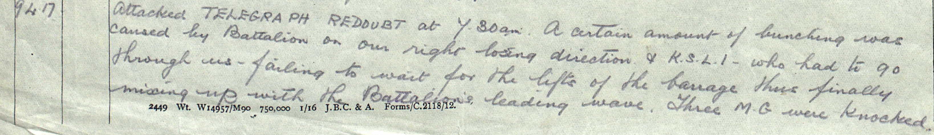 John suffered a gun shot wound to the face on the 9th April 1917 during an attack on the Telegraph Redoubt by the Battalion. The Battalion suffered 5 Officers killed and 8 wounded; 45 Other Ranks killed, 116 wounded and 11 missing.