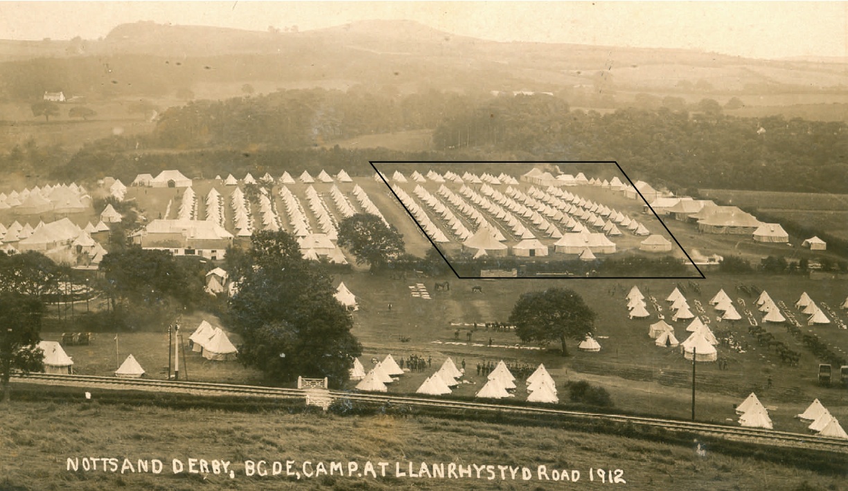 1912 and the North Midland Divisional Camp at Llanrhystyd road. The 5th Battalion Camp itself is indicated by the rectangle and was located on farm land close to Aberbrwynen and was bounded to the north by the Milford & Manchester Railway and to the south by the River Ystwyth. The 6th Battalion were to the left of the 5th and the ambulances of the North Midland Field Ambulance can be seen in the bottom right corner.