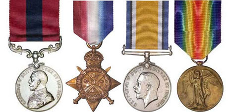 He holds the DCM, 1914-1915 Star, BWM & VM, LS&GC, TFEM, French Medaille Militaire. Medaille Miltaire, London Gazette, 1/5/1917, D.C.M., London Gazette, 1/1/1918 and Despatches.