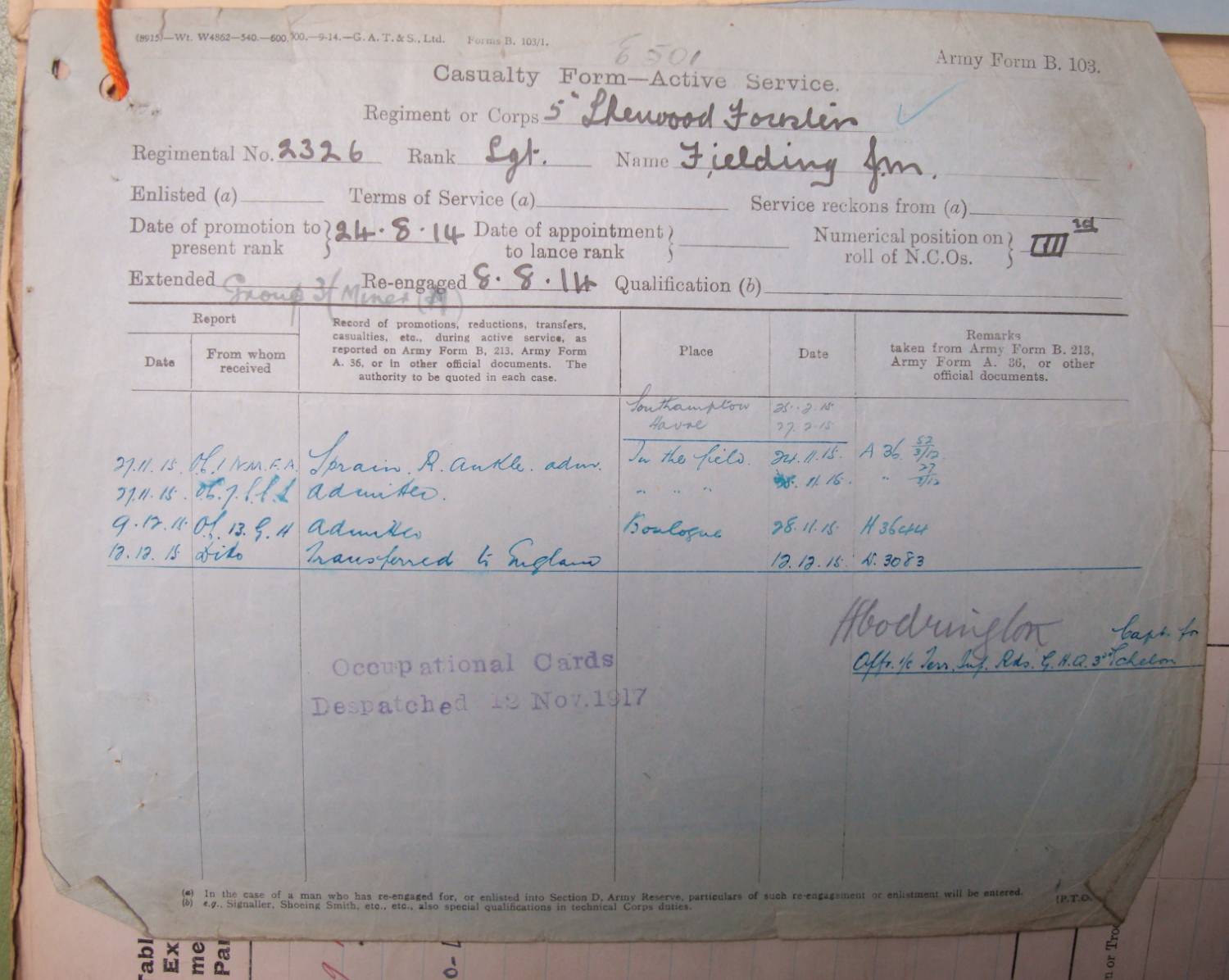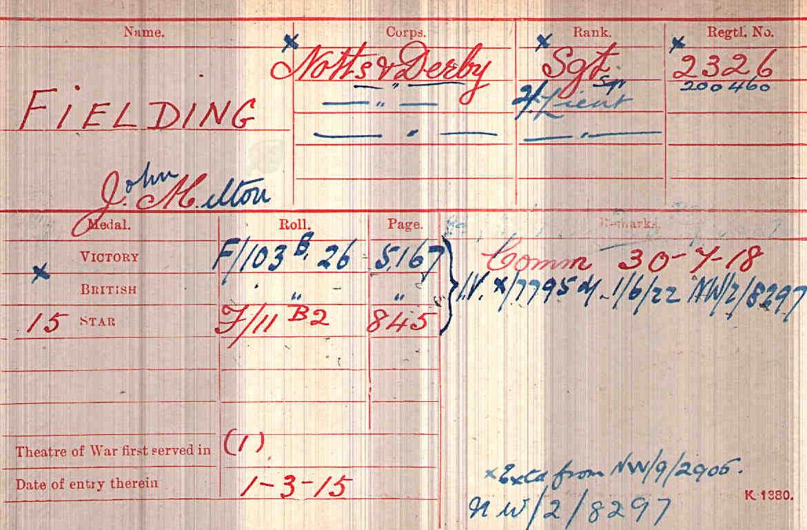 2/Lt J. M. Fielding was later attached to the Royal Air force but returned to the 3rd Reserve Battalion Notts & Derby stationed at Roker near Sunderland on the 27th January 1919.