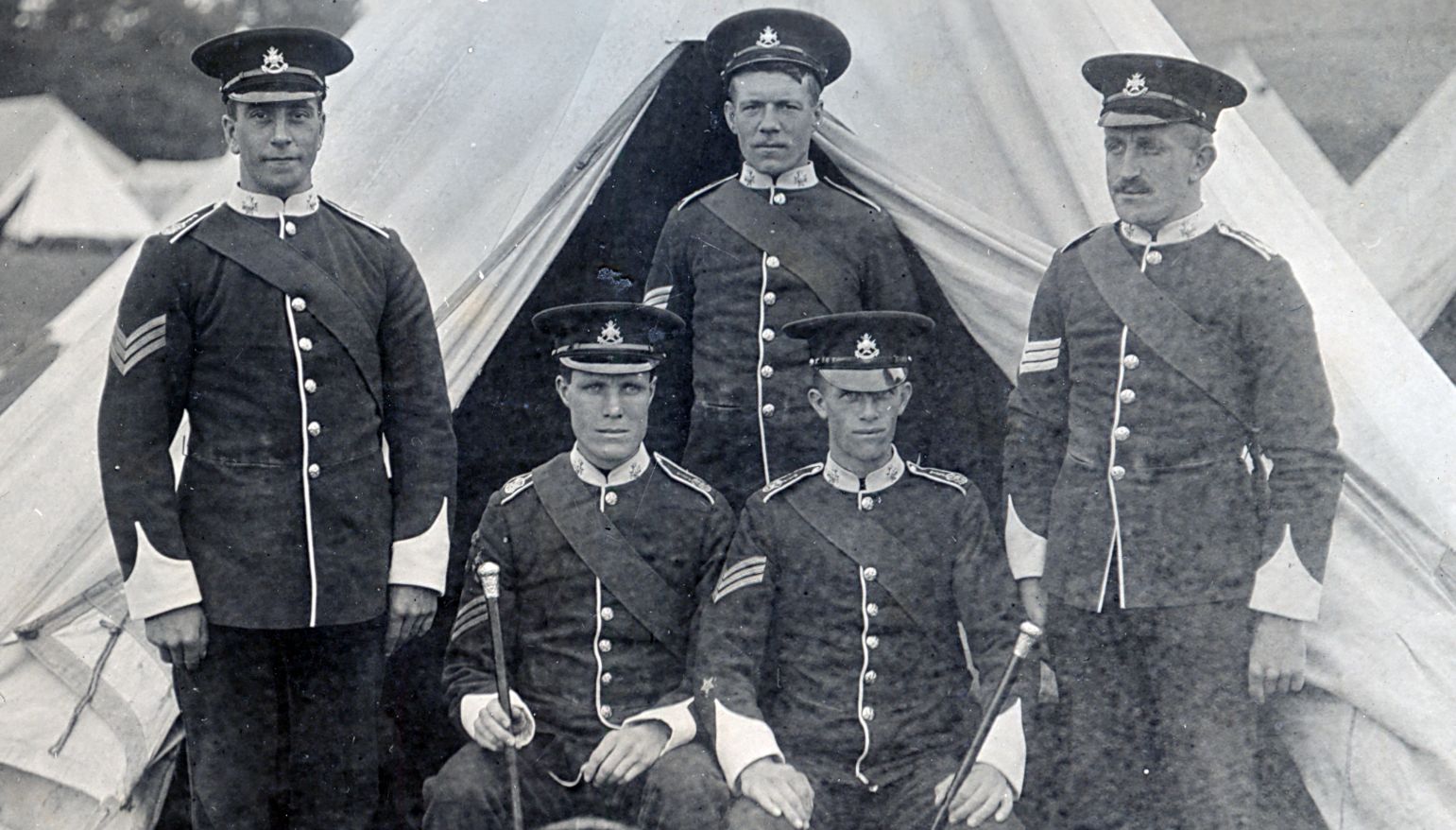 “With very good wish to the Sergeants of H Co, from the Waiter”. This postcard shows a Sergeant’s mess that is well stocked with Allsopp’s beer at the annual camp of 1912. Standing at the bar is 2 Regimental Quartermaster Sergeant Harry Petrie. Harry was born in Winchester in 1872 but moved to Derby where he was a sorting clerk and telegraphist. He enlisted in to the 5th Battalion on the 1st April 1908 having previously served in the 1st VB, the Sherwood Foresters from 1890. He arrived in France on the 1st March 1915 and was discharged time expired in April 1916, aged 44. Also present in the picture are several other sergeants relaxing in blue patrols or mess jackets. The tall man standing at the back is possible a Police Sub Inspector of a the Cardiganshire Constabulary. Samuel Allsopp & Sons was one of the largest brewery companies operating in Burton-upon-Trent and would have been a local brewery for Castle Gresley.