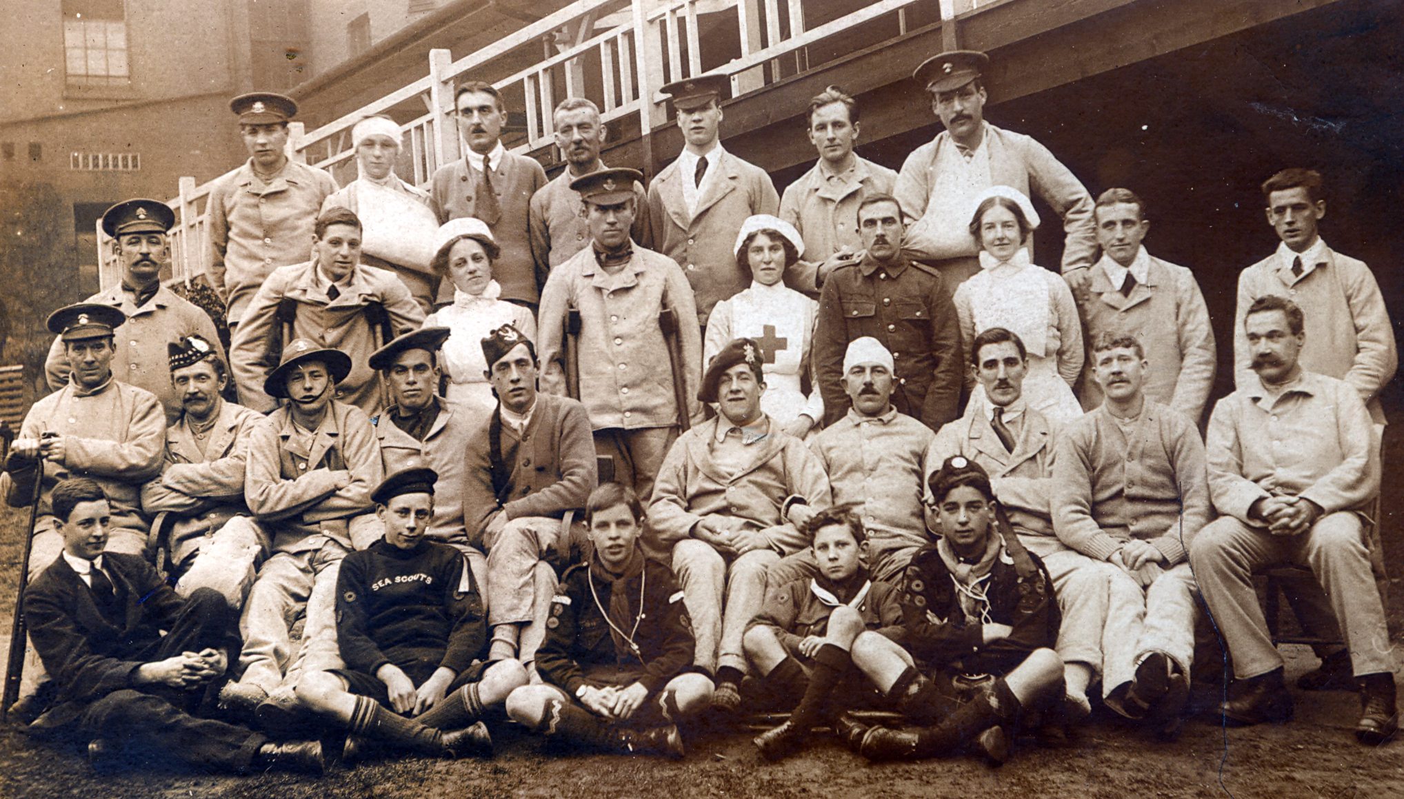 Thomas Ison was invalided to England late in 1915. He spent several months in Hospital before being discharged from the Army in April 1916 due to wounds. Tom spent Christmas in Hospital and was given a special Christmas gift by the Lord Lieutenant, City and County of Nottingham, “sent as a slight token of the high appreciation entertained by the community of the valour and achievements of its fighting men on land and sea”. Both of these photographs were taken by “Godfrey, Duke St. Basford, Nottm” and show men from a number of different regiments including the Royal Scots, Northumberland Fusiliers and several Scottish Regiments. Also present are boys from the local Scouts and Sea Scouts.