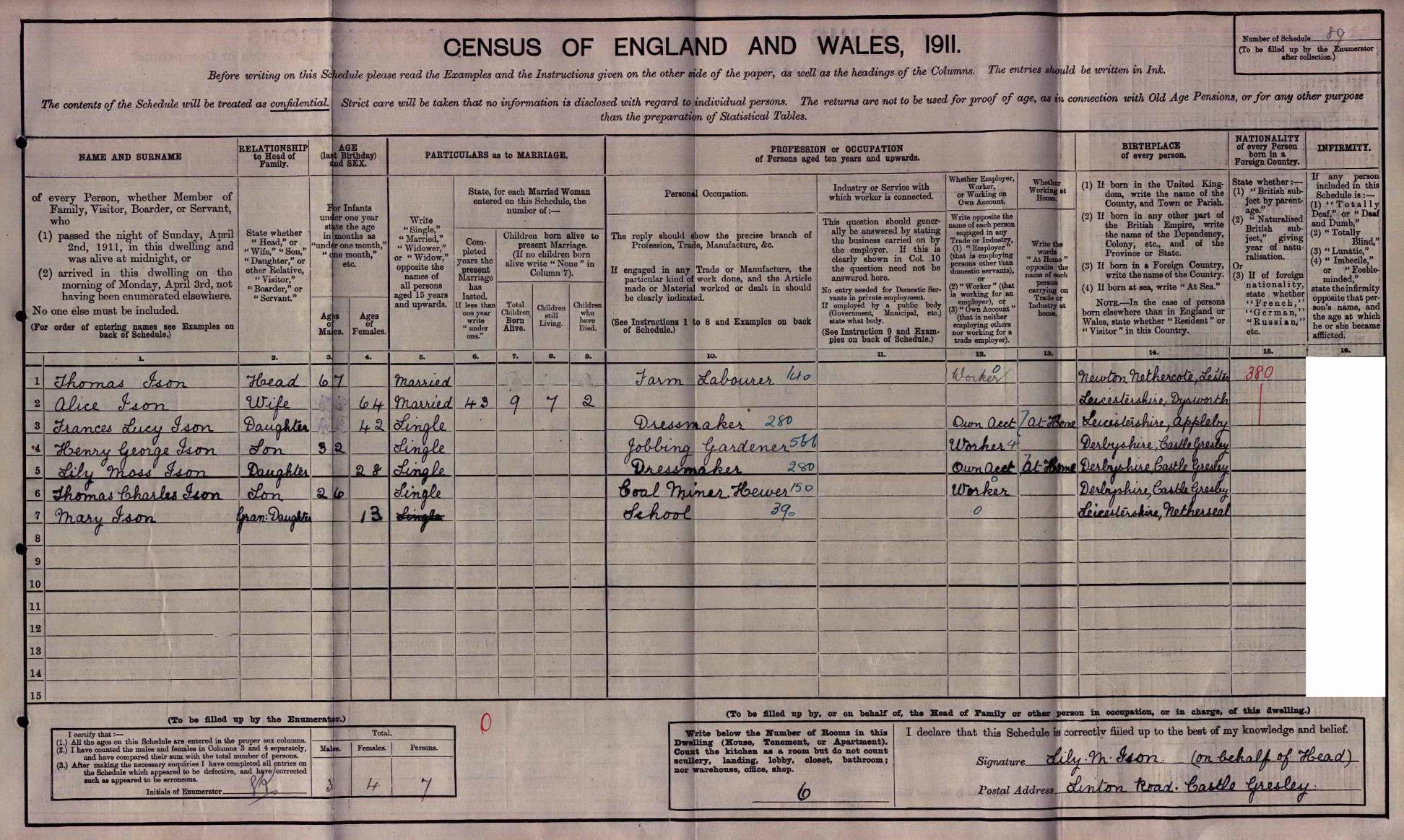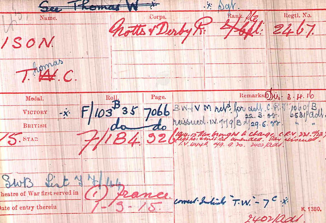 Thomas Charles Ison was born in 1885 in Castle Gresley near Swadlincote in south west Derbyshire. He was a coal miner ‘hewer’ by trade and in 1911, aged 26, he still lived with his parents Thomas and Alice at Linton Road in Castle Gresley. Thomas enlisted into the 5th Battalion Notts and Derby Regiment prior to the War and certainly before 1910. Indeed, he may have been a member of the original 1st Volunteer Battalion the Derbyshire Regiment. However, at some point, possibly because he was ‘time expired’, Thomas left the Battalion, only to re-enlist on the 8th August 1914, just four days after the battalion had mobilised at Derby.