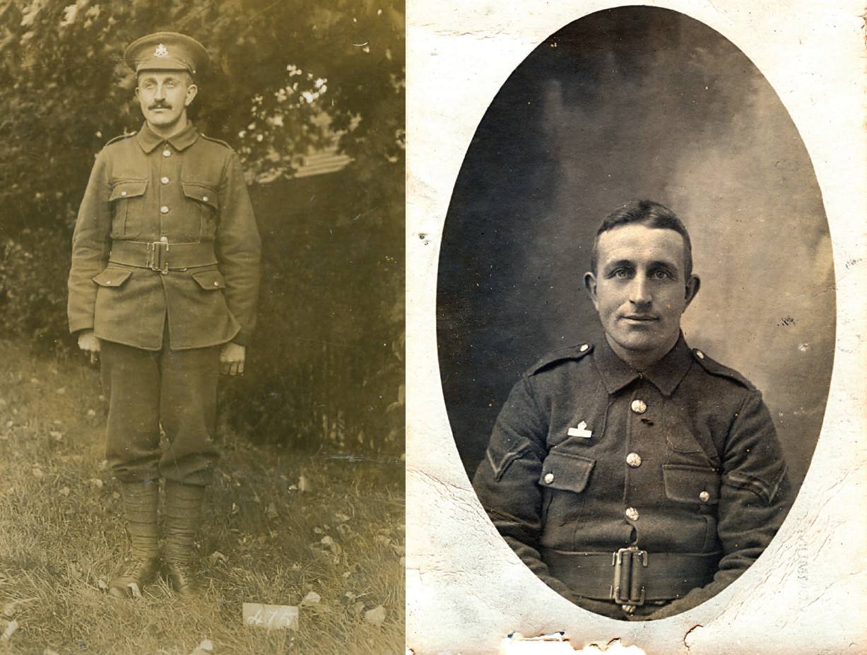 After re-enlisting as a private into the 5th Battalion Sherwood Foresters in August 1914, Tom Ison was sent first to Harpenden (top left) and then with the Battalion to Braintree in Essex (top right). By the time the Battalion moved to Braintree Tom had been promoted to Corporal and had signed the Imperial Service Agreement. This picture was taken at `Ray Studio, 37 London Road, Braintree’.