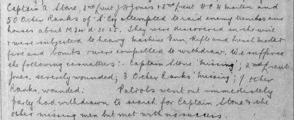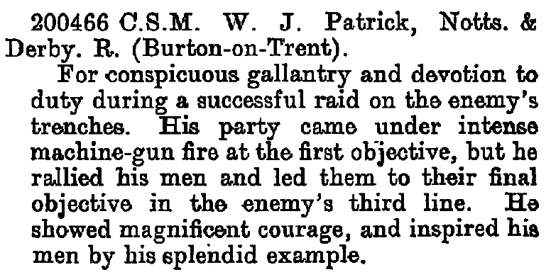 During an unsuccessful trench raid by “C” Company on the night of the 28th/29th April 1917, Bill Patrick and the medical officer (Captain Suttie) went out into no-mans-land on several occasions to help bring in the wounded.