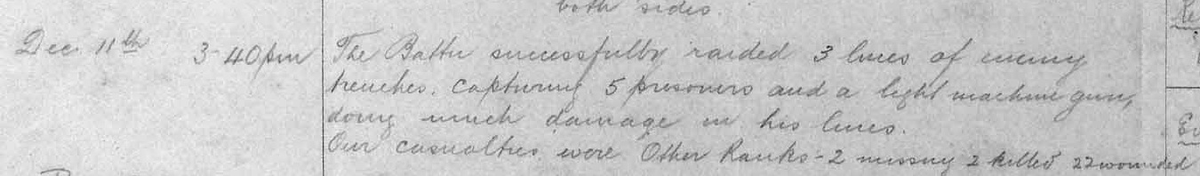 Bill was mentioned in dispatches during the attack on Lens in July 1917 and was also awarded the Distinguished Conduct Medal for a successful raid on enemy trenches in the St Elie right sector on the 11th December 1917. This daylight raid by Captain D Smith and men of “A” and “C” Companies entered the first three lines of German trenches and the men returned with 5 prisoners and a light machine gun. The Battalion suffered 2 men killed, 22 wounded and 2 missing.
