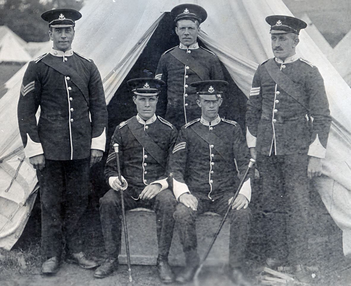 Sergeants of “H” Company, 5th Battalion. Post card is part of the H.P. Hanson series and shows at the front and from the left Jack Fielding, Bill Patrick, Bert Maddock and Tom Ison with an unknown Sergeant of “H” Company. This picture was possible taken at the annual camp of 1913.