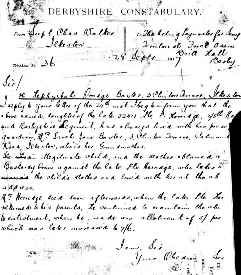 Derby ConstabOn 28th September 1917 Superintendant Charles Walker reported to the Territorial Force Association that Vincent Horridge had fathered a child out of wedlock. His daughter, Hephzibah Horridge Baxter was living with her grandmother in Chapel Row, Newthorpe following the death of her mother. They were granted a pension in October 1917.