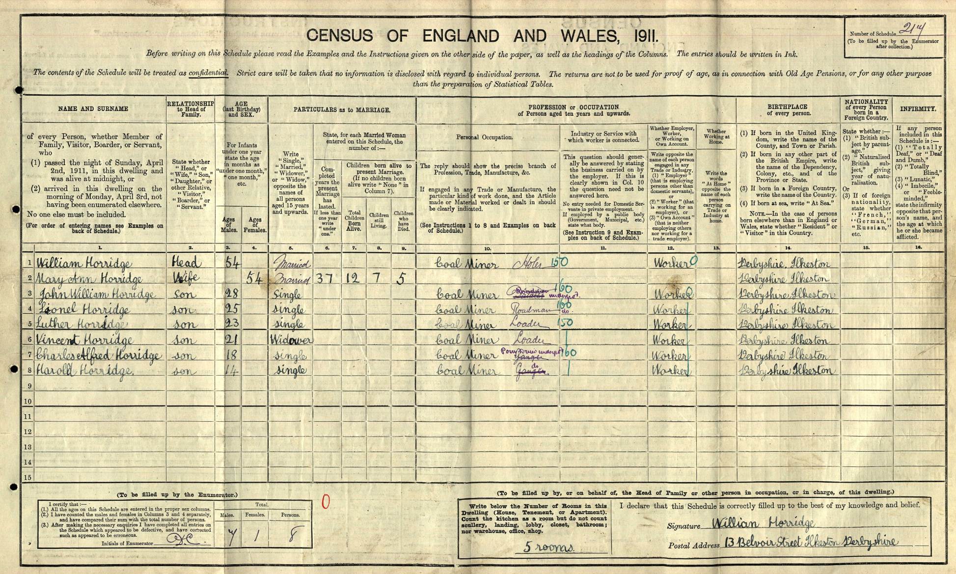 Horridge 1911 censusThe 1911 Census records Victor as a widower at aged 21