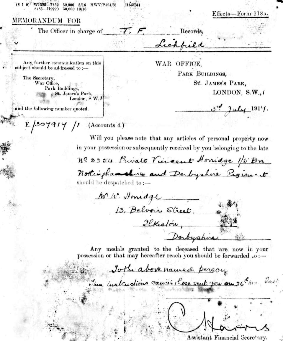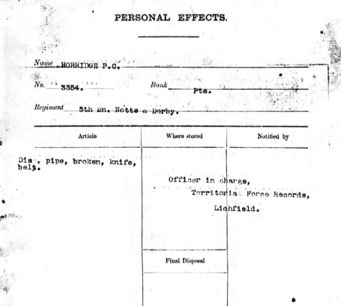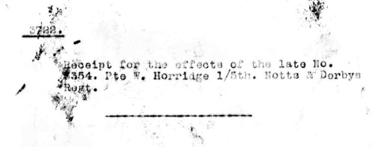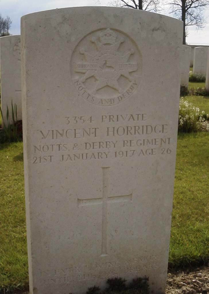 • 3354 Pte Vincent Horridge aged 26 and killed in action on 21/01/1917 foncquevillers military cemetery, i. f. 13., son of william and mary ann horridge, of 13, belvoir st., ilkeston, derby.