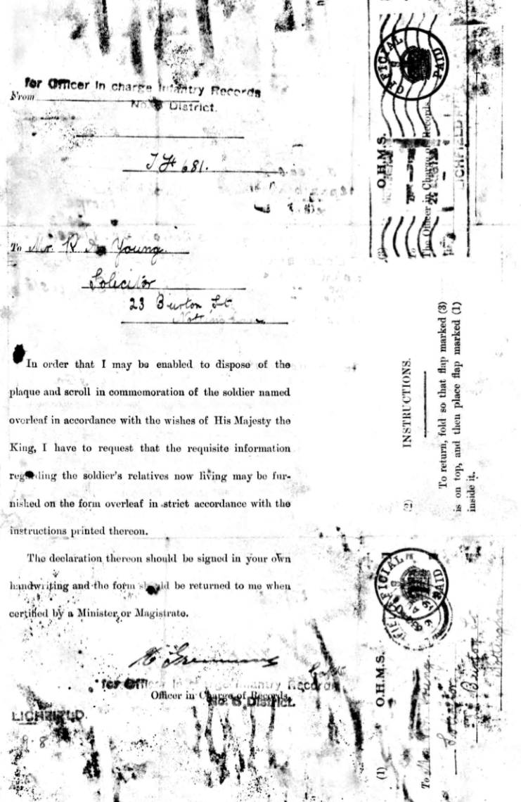 War VictoryVincent’s British War and Victory Medals were received by his father William in 1921 (above), however, it would appear that the War Office were unable to locate any next of kin for the Plaque and Scroll (below).