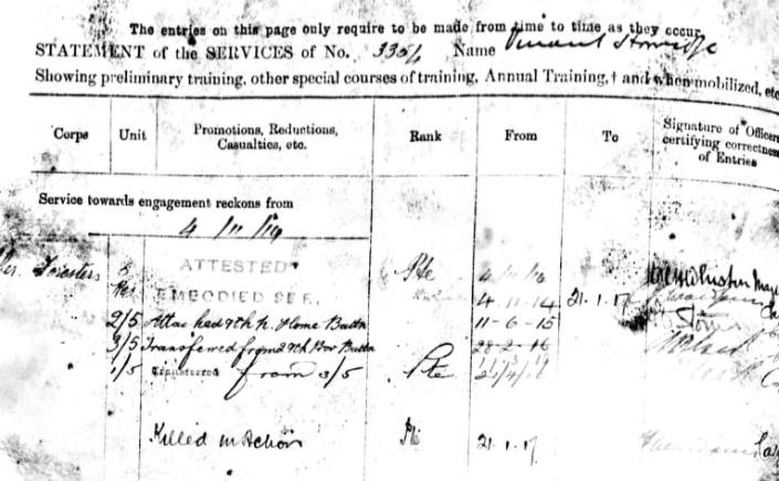 Active Service FormHe was killed in action in the trenches near Fonquevillers on 21st January 1917 and is buried in Foncquevillers Military Cemetery.