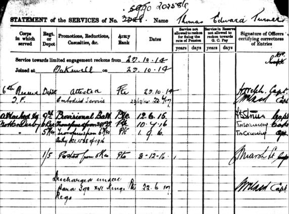 Service record for Thomas Edward Turner recording his enlistment into the 6th Reserve Battalion (2/6th) on the 20th October 1914 (3328) and his attachment to the 9th Provisional Battalion on 12th June 1915. He was transferred the to the 6th Reserve Battalion (3/6th) on the 10th July 1916 and then then into the newly formed 5th Reserve Battalion on the 1st September 1916 and issued with the number 5990. He was re-numbered 202586 during the 1917 Territorial Force renumbering in spring 1917 before being discharged in June 1917. He did not serve overseas.