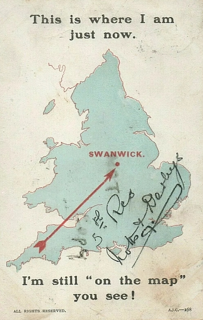 Humorous postcard sent from Swanwick sent by by CSM Luke Marshall to his daughter at 87 Nightingale Rd, Derby.