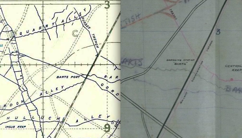 Frederick was killed in action during the attack at Hohenzollern Redoubt on the 13th October 1915. His Army Service Records incorrectly records that his body was buried at A.28.A.8.4 (above). However, his body was later recovered from Barts Alley B Cemetery (G.3.C.5.5.) by the 18th Labour Company in March 1920 and reburied in Loos British Cemetery (below). Map2104 Nall burial