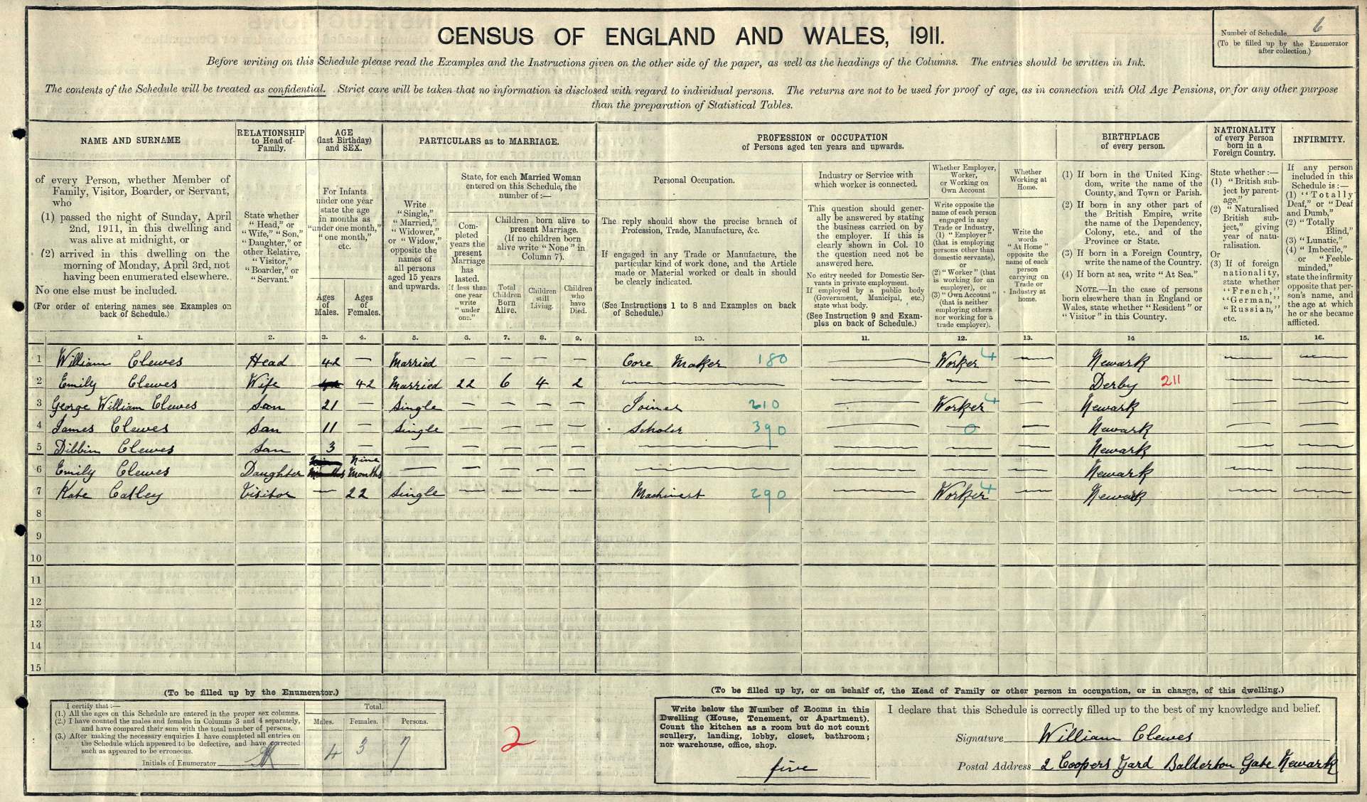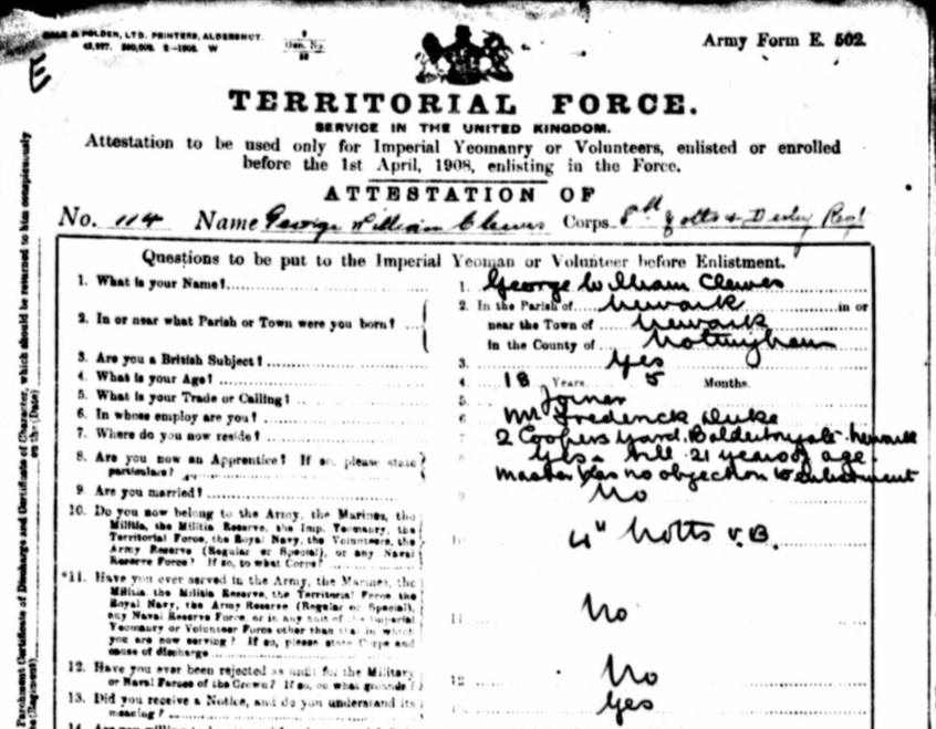 1911 Census recording William and Emily with their four children living at 2 Coopers Yard in Balderton Gate, Newark. Their eldest son George William was also a member of the 8th Battalion and had previously served with the 4th Volunteer Battalion (1902-1908).