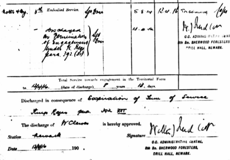 In April 1908 William re-enlisted into the 8th (Nottinghamshire) Battalion, the Sherwood Foresters at the age of 39 and attended all the Annual Camps between 1908 and 1913. .