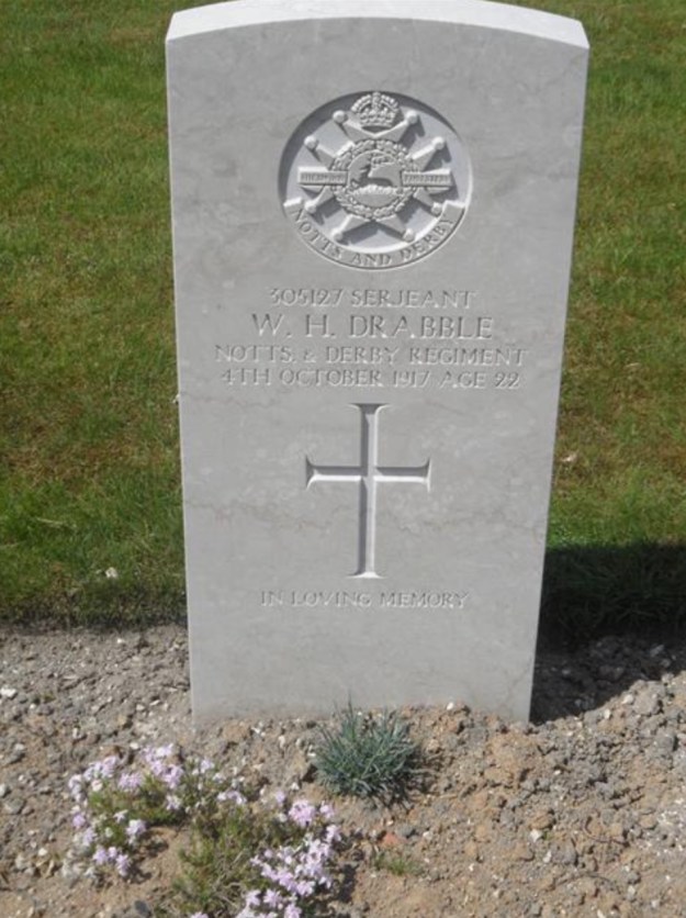 Served in ‘B’ Company. He is buried in Philosophe British Cemetery, Mazingarbe (grave ref. II.U5). ‘The Sherwood Foresters in the Great War 1914-1919, 1/8th Battalion’, p.209 (St Elie and Hill 70, 1917-1918): ‘Our most unpleasant experience undoubtedly was on October 4th when we got caught in the bombardment connected with an attempted Boche raid on the 7th Battalion whom we were relieving … B Company unfortunately got mixed up with some of the shelling and lost several men, including Sergt. Drabble, who was killed.’ Serge. W. H. Drabble Worksop Guardian 2 November 1917 Information has been received by Mr. and Mrs. Drabble, Easthorpe, Southwell, that their eldest son, Serge. W. H. Drabble, Sherwood Foresters was killed in action on October 4th, two days prior to his 23rd birthday. Sergt. Drabble was offered a commission in February last, but he declined. For nearly 12 months prior to the War, Sergt. Drabble was assistant with Mr. G. T. Smith, grocer, Bridge Place, Worksop, by whom he was highly esteemed. Of a very genial disposition, he made many friends amongst the young men in the town. He was a keen footballer and a member of the Worksop Thursday Team. The news of his death will be deeply felt by his friends in Worksop, and their sympathy will go out to his parents in their bereavement.