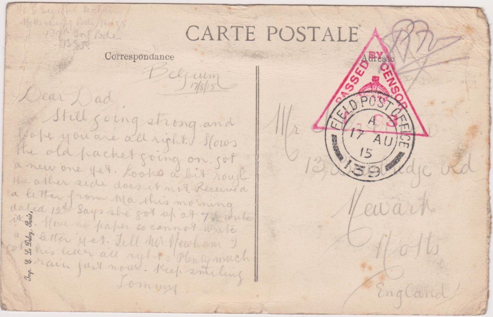 The card was posted from the Field Post Office of the 139th Brigade on the 17th August 1915 and was passed by the Censor.