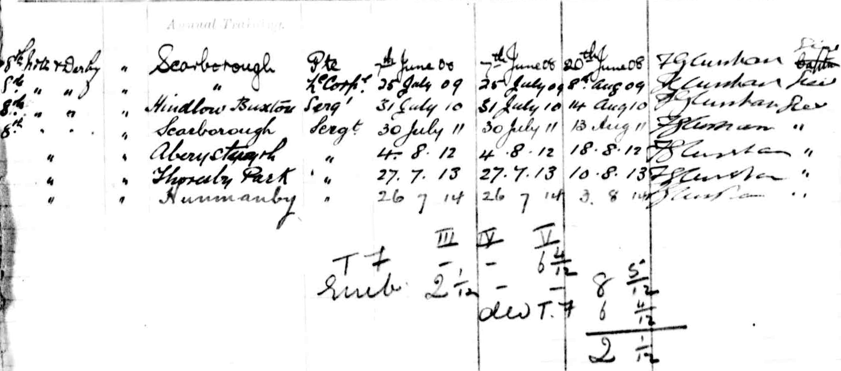 Chalres attended the Annual Camps at Scarborough (in 1908, 1909 and 1911), Hindlow (1910), Aberystwyth (1912), Thornsby Park (1913) and Hummanby (1914).