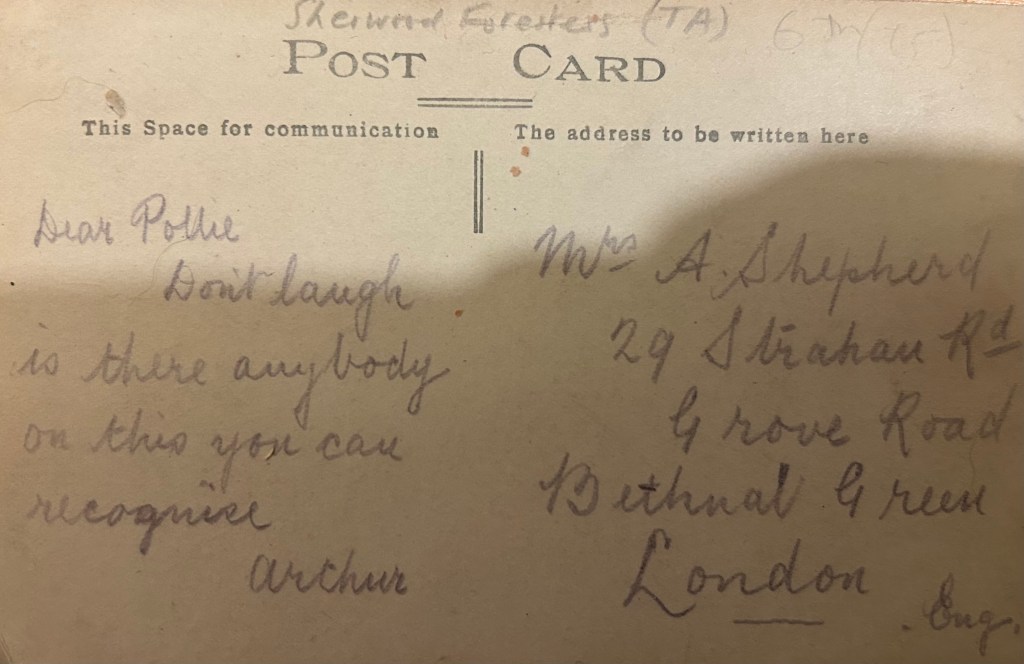 Note the 4th V N&D cloth badge on his right shoulder (example shown below) and the 3-tier ‘T 8 Notts & Derby’ badges that some of the other men are wearing. This post card was sent to his wife Lucy in Alfreton from Hindlow Camp in 1910.
