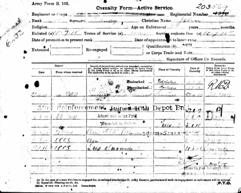 John was a conscripted soldier posted to a training Battalion of the Sherwood Foresters in the summer of 1917 and would most likely have arrived in France at the end of 1917