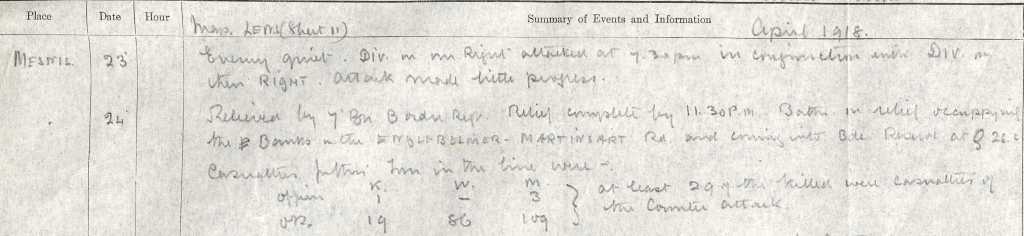 “All our casualties were nearly all from bombs and shell fire and a certain amount of machine gun. Bombs were thrown at our first wave from their front line. They barraged their own front line after we got in an NO MANS LAND with 5.9 and Trench Mortars””Their casualties appeared to be very heavy and the trenches in parts full of dead.”