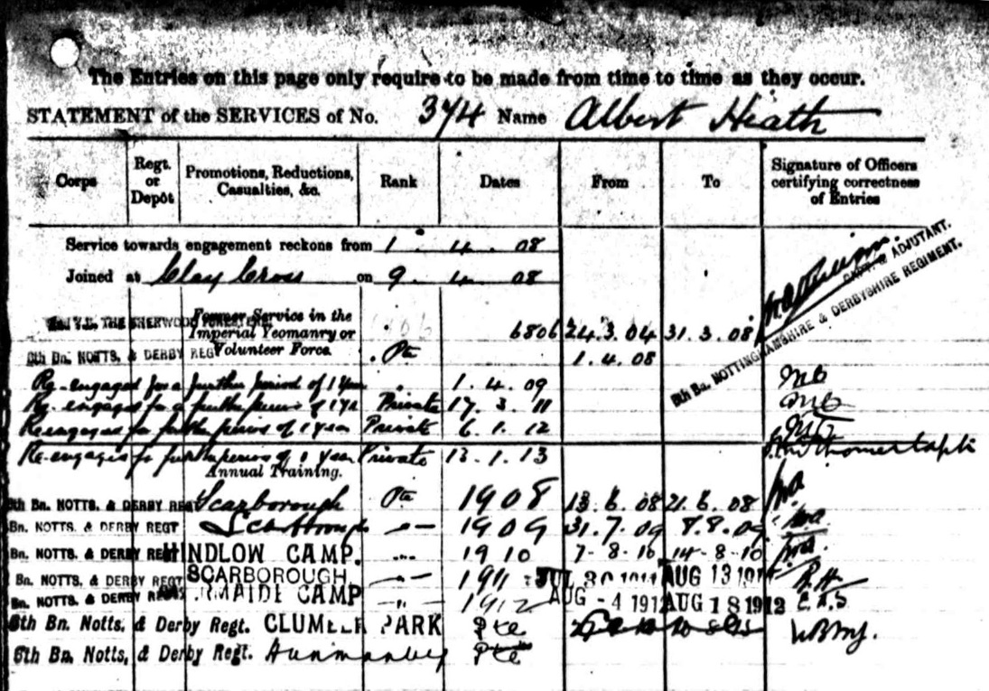 Albert enlisted into the 2nd Volunteer Battalion Sherwood Foresters in March 1904 and re-enlisted into the 6th Battalion Notts and Derby Regiment on the 1st April 1908. He attended all the Annual Campus between 1908 and 1914.
