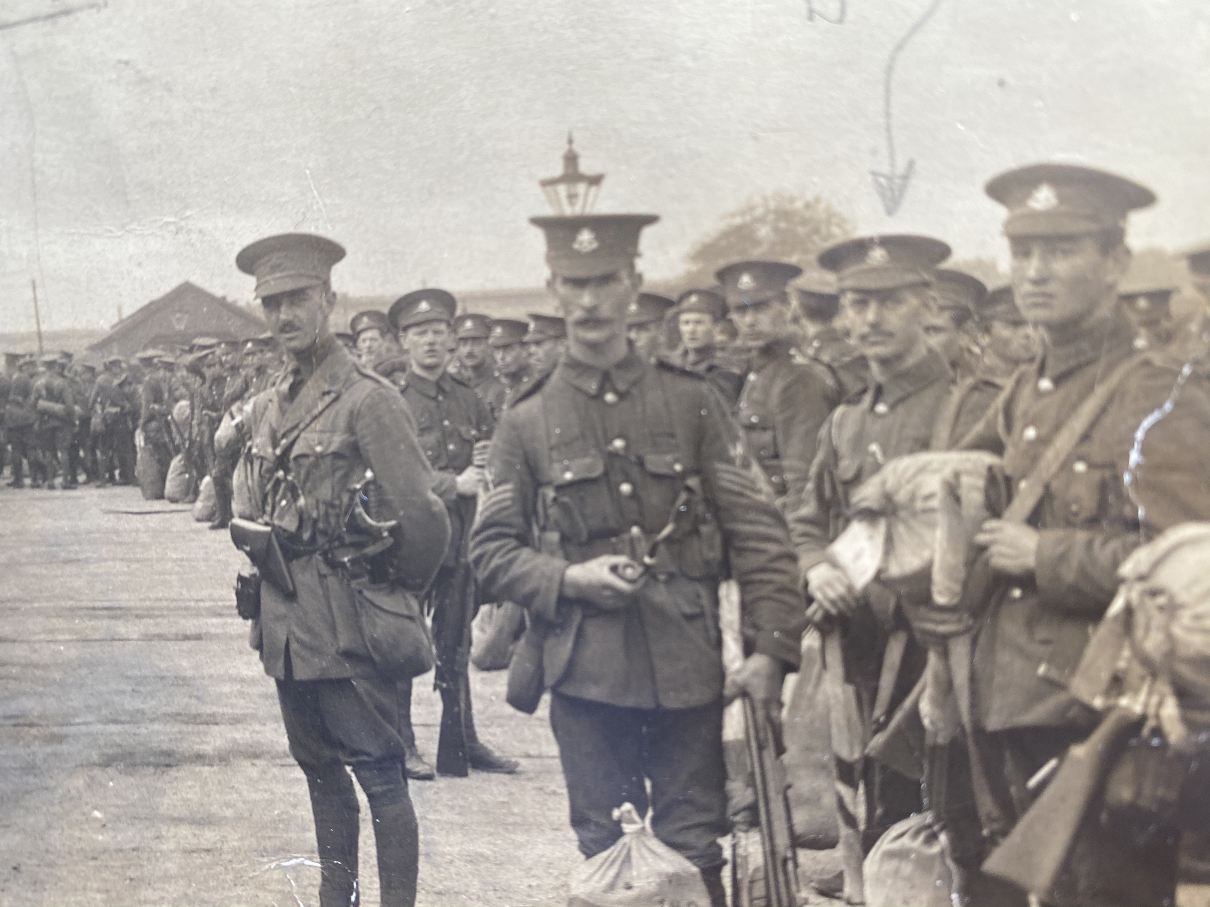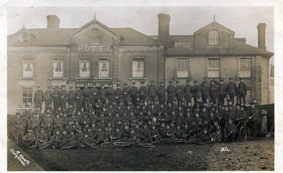 Men of the 1/5th Battalion entraining for Luton from Friar Gair Station in Derby on the 16th August 1914. The arrow indicates John Burton and on the back is written “Signallers 1/5th Sherwood Foresters”. Also identified on the back are Signalling Officer Captain Reginald J Case and Signalling Sergeant H Bonnell.
